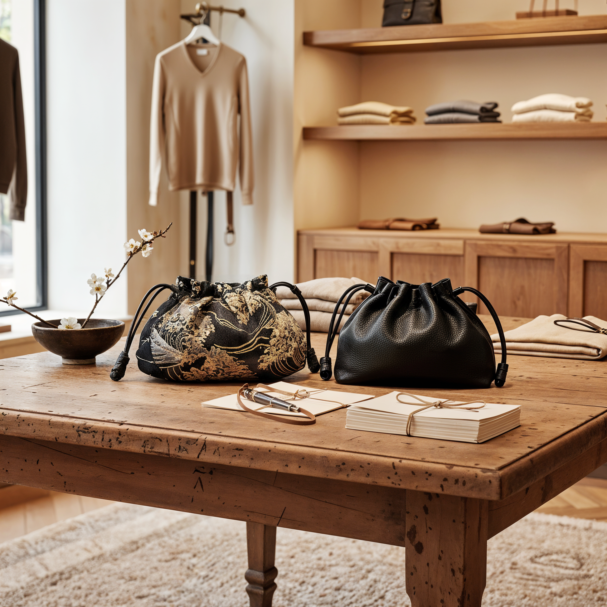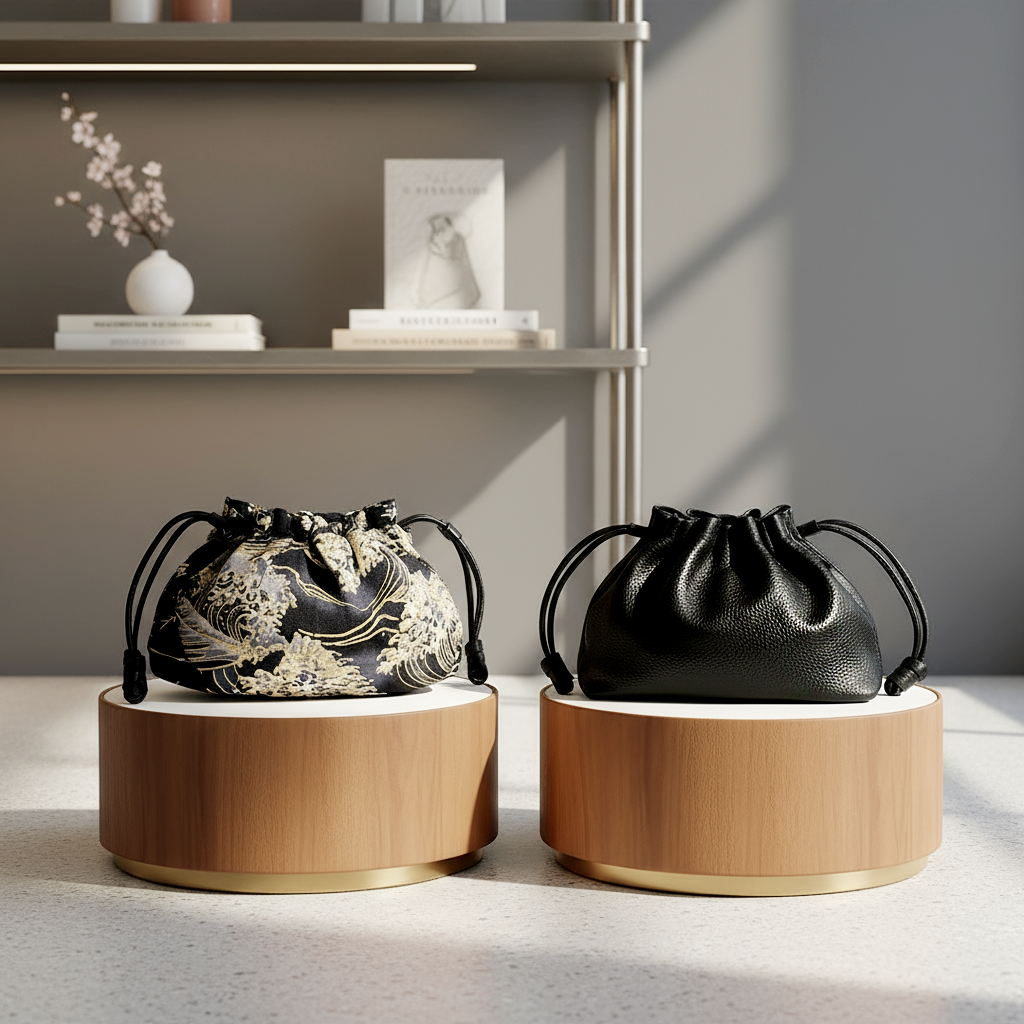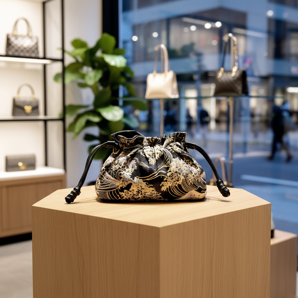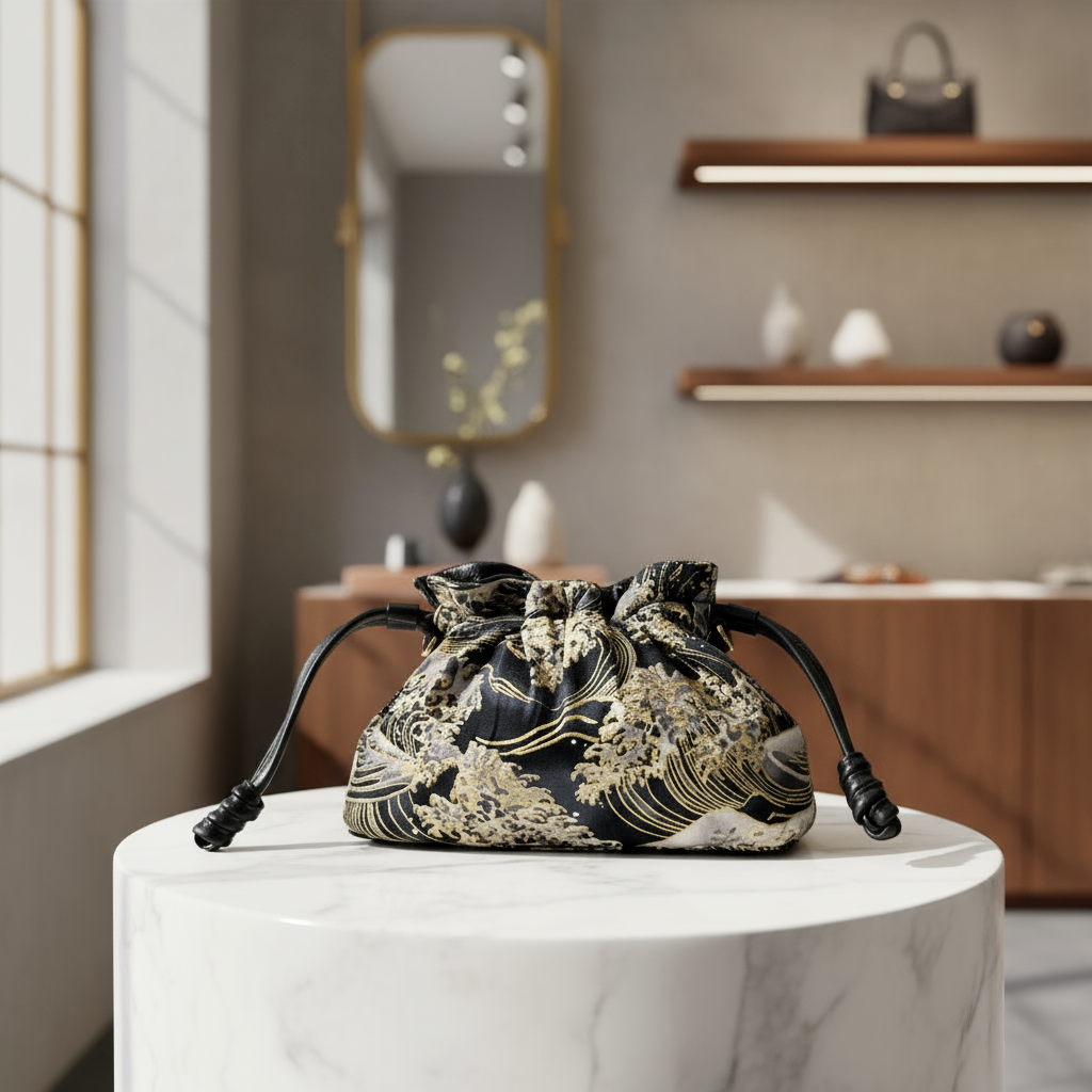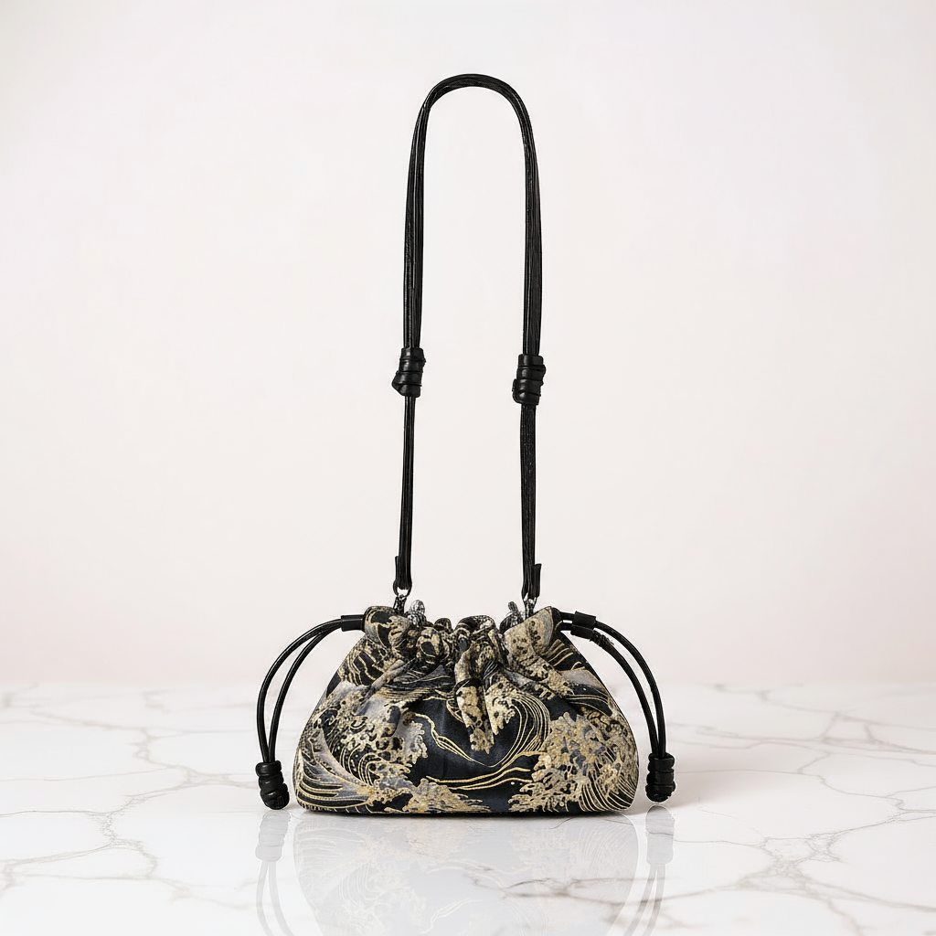 Discover the timeless elegance of the Reversible Kinchaku Bag by ObiBi Tokyo. Handcrafted in Japan, this unique pouch features a dark blue and gold “Japanese Waves” design on authentic cotton fabric, paired with soft Italian nappa leather on the reverse side. Inspired by traditional kinchaku once carried with kimono, it blends heritage and modern craftsmanship. Small but spacious, luxurious, and versatile — a refined statement piece for day or evening wear.