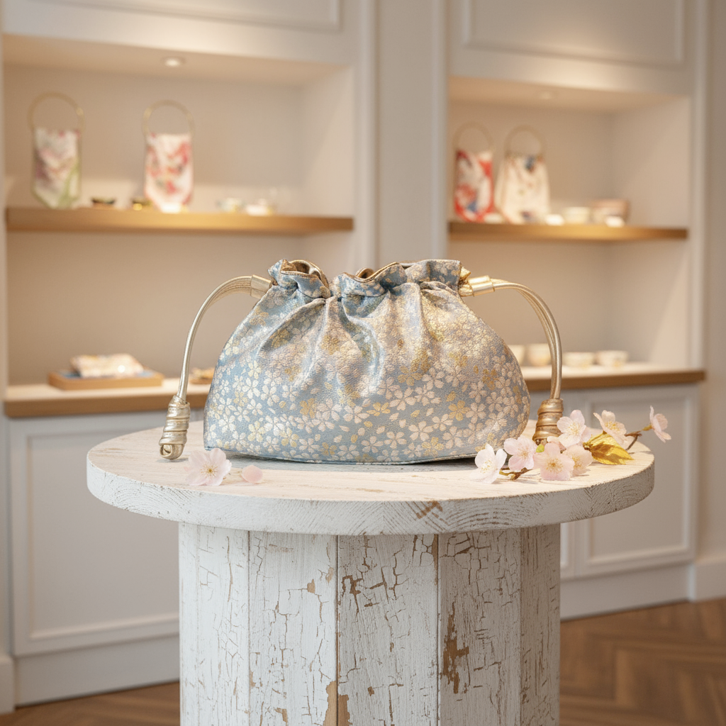 This modern version features two exquisite sides: one crafted from authentic Japanese cotton adorned with delicate sakura (cherry blossom) motifs in soft sky blue, and the other from luxurious Italian nappa leather in a radiant gold finish. The result is a versatile bag that blends timeless Japanese tradition with contemporary elegance.